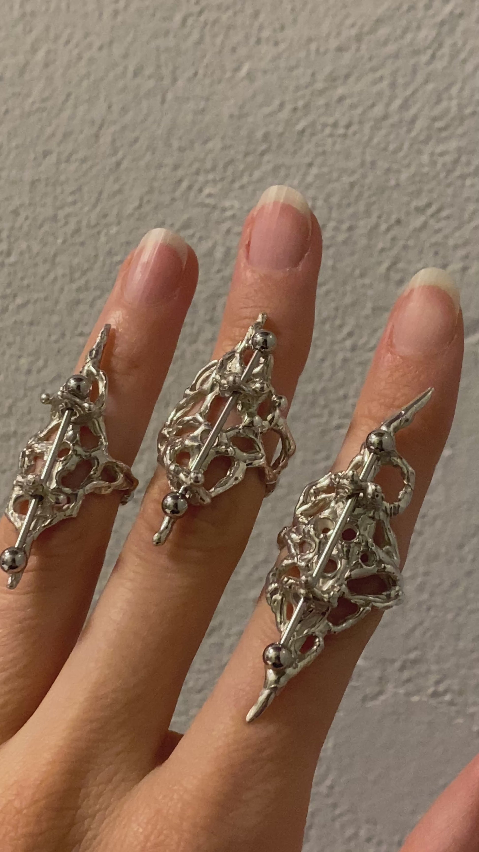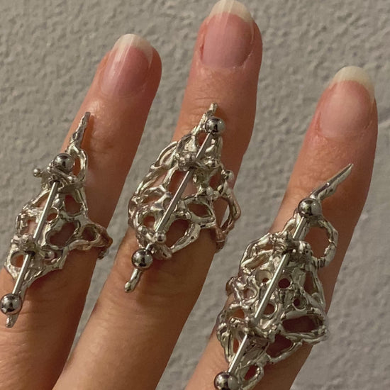 Großer Ring mit komplexen Aussparungen und einem langen Piercing aus 935 Silber.